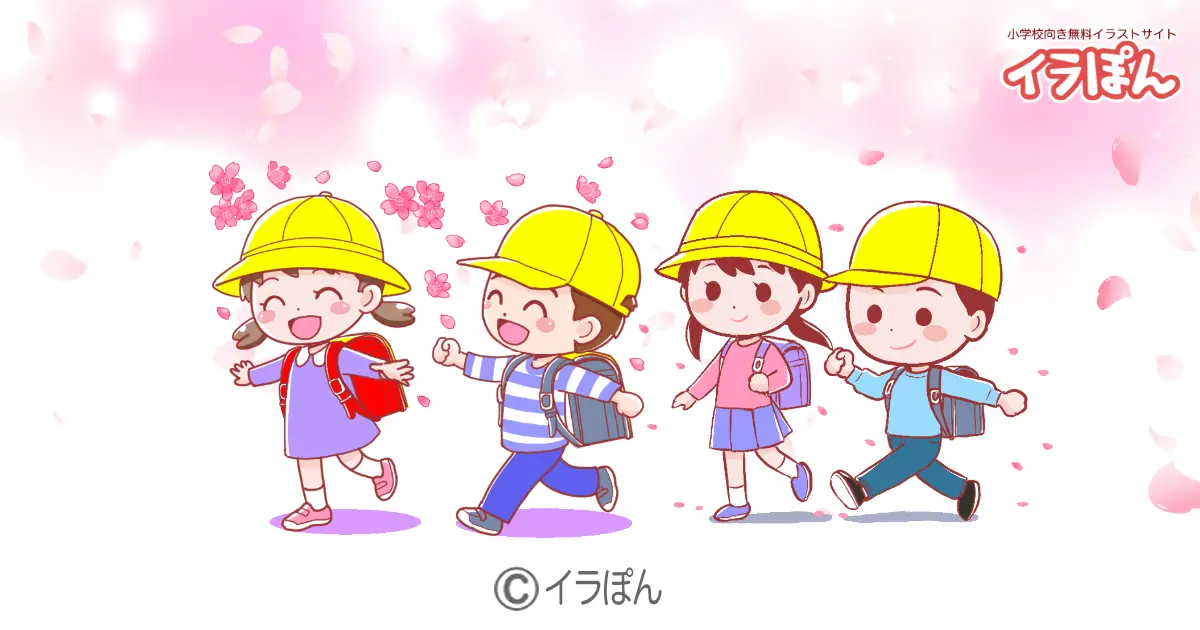 桜が舞う中を楽しそうに学校に通学している新1年生のイラストです